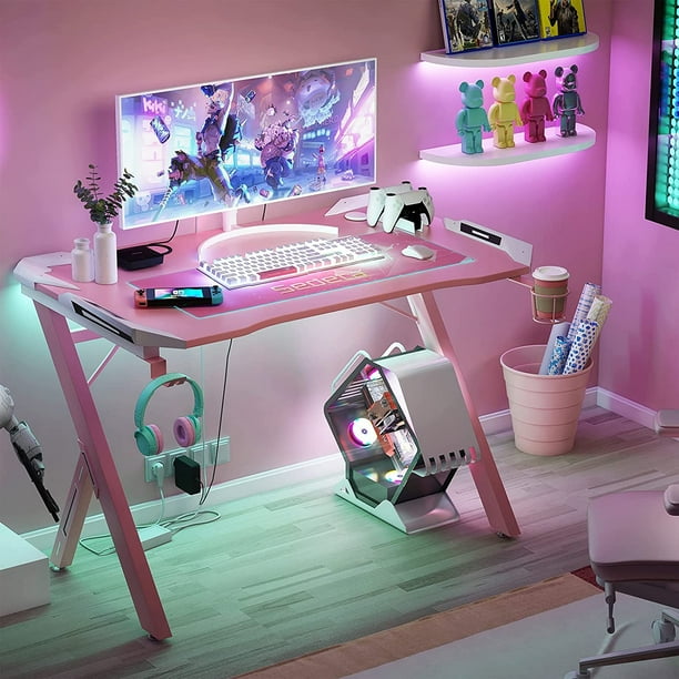 Pink Computer Gaming Desk Ergonomic R Shaped Professional Gamer Table With Headphone Hook Rotatable Cup Holder Free Mousepad Home Office Desk Gamer Desk Study Writing Table Pink Walmart Com